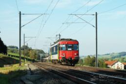 Einsätze von Solo-RBe 540 im Personenverkehr sind selten. Die einzigen öffentlichen Fahrten ohne Anhängelast sind die Regionalzüge Romont-Palézieux, die nur zur Hauptverkehrszeit verkehren. Eine Fahrt mit einem solchen Zug ist für RBe-Fans ein Erlebnis, da der Triebwagen seine Beschleunigung voll ausspielen kann. An einem warmen Julitag ist das erste Serienfahrzeug mit der Nummer 006 für ebendiese Regionalzüge im Einsatz. Kurz nach dem Bahnhof von Siviriez rauscht er dem Tunnel von Vaudrens zu. Im Hintergrund ist der alte Bahnhof von Siviriez sichtbar, der durch eine RV05-Station weiter in Richtung Romont ersetzt wurde. (Foto: Dominic Stucki)