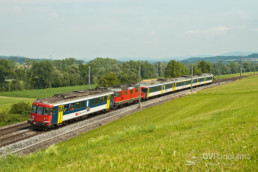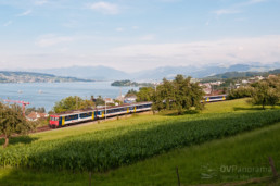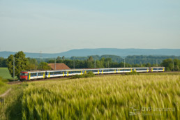 Zwischen Zürich und Zug sind die RBe-Einsätze schon massiv zurückgegangen. Noch vor wenigen Jahren waren die Züge der S21 und S24 noch völlig in der Hand von RBe 540 und RABDe 510 «Mirage». Heute hingegen werden nur noch einzelne Züge der S21 mit RBe-«Sandwiches» geführt. So auch an diesem warmen, aber leicht bewölkten Juli-Abend, als der Schatten des Hügels schon nahezu die Bahnlinie bei Horgen Oberdorf erreicht. Noch reicht aber das Licht für ein Bild dieses langen RBe-Pendels, der als S21 auf dem Weg nach Zürich ist. (Foto: Dominic Stucki)