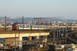 Die Komplexität der Gleisanlagen im Vorfeld des Zürcher Hauptbahnhofs wird schweizweit nicht überboten. Mit Brücken und Überwerfungen werden die meisten Strecken niveaufrei ausgefädelt, um einen möglichst reibungslosen Betrieb zu gewährleisten. So stören denn auch die beiden RBe, die soeben in luftiger Höhe das Gleisvorfeld überquren, die Einfahrt der FV-Züge zur Spinne nicht im geringsten. RBe 540 024 (erkennbar am Übergangsblech) hat als S nach Bülach soeben den Bahnhof Hardbrücke verlassen und schraubt sich auf dem Viadukt zum Käferbergtunnel in die Höhe. Das andere «Sandwich» hat vor kurzem den Viadukt von der UA Herdern zum Vorbahnhof überquert und wartet auf grünes Licht für die Fahrt in die Bahnhofshalle. (Foto: Dominic Stucki)